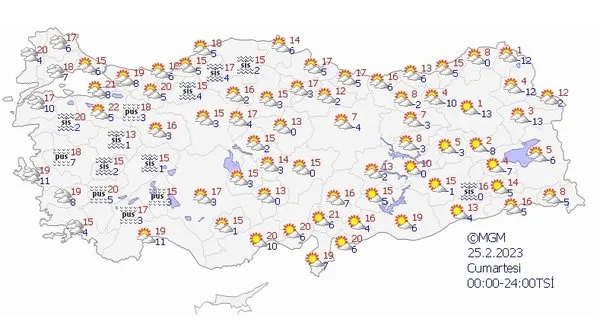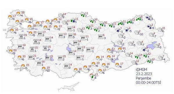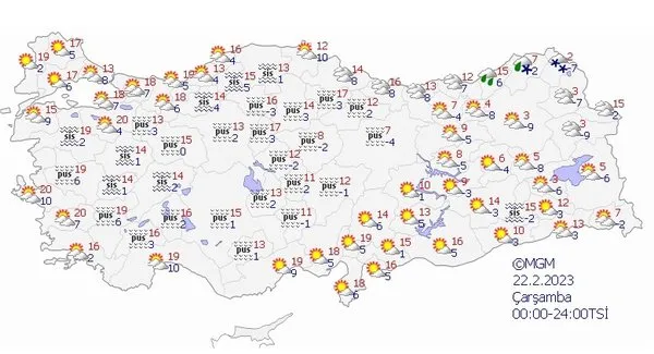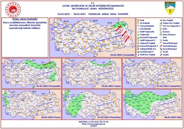 22 Şubat Çarşmba günü Türkiye'nin kuzey, iç ve doğu kesimlerinin parçalı ve çok bulutlu, Rize, Artvin ve Ardahan çevreleri ile Kars'ın kuzey kesimlerinin yağışlı geçeceği tahmin ediliyor.
