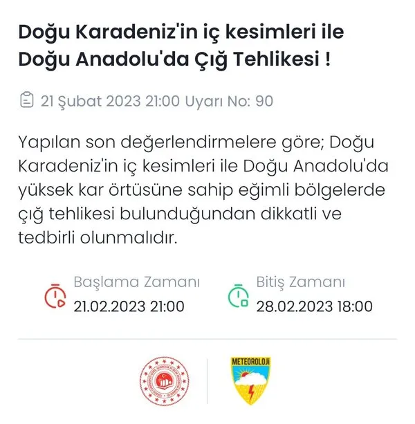 Meteoroloji Genel Müdürlüğünden yapılan açıklamada, Doğu Karadeniz'in iç kesimleri ile Doğu Anadolu'da yüksek kar örtüsüne sahip yerlerde çığ tehlikesinin bulunduğu kaydedildi.