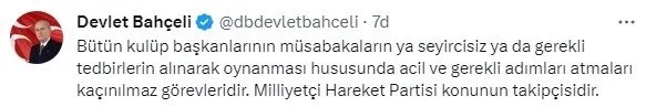 Bütün kulüp başkanlarının müsabakaların ya seyircisiz ya da gerekli tedbirlerin alınarak oynanması hususunda acil ve gerekli adımları atmaları kaçınılmaz görevleridir. Milliyetçi Hareket Partisi konunun takipçisidir.
