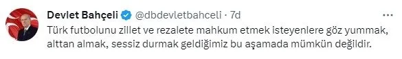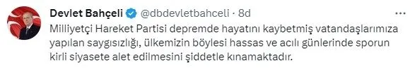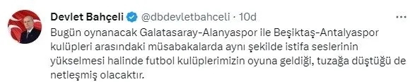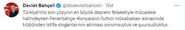 MHP Genel Başkanı Devlet Bahçeli, "Türkiye'miz son yüzyılın en büyük deprem felaketiyle mücadele halindeyken Fenerbahçe-Konyaspor futbol müsabakası esnasında tribünden istifa sloganlarının atılması sorumsuzluk ve şuursuzluktur" dedi.